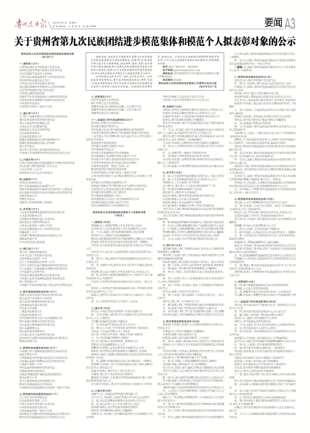 公示时间从2025年8月7日起,至8月14日止。如对拟表彰对象有异议,请于公示期间通过电话、邮件、信函(以到达日邮戳为准)等方式向贵州省第九次民族团结进步表彰工作领导小组办公室反映。反映情况须实事求是、客观公正。以单位名义反映情况的材料需加盖单位公章,以个人名义反映情况请告知或签署实名,并提供联系电话。
